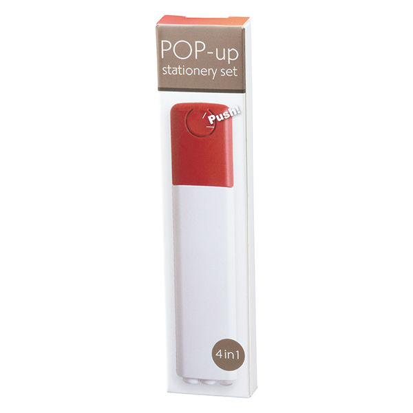 ワンプッシュで飛び出すポップアップケースに、ボールペン2色とメタルペンシル、セラミックオープナーが収納された便利なセット。 ボールペンは使い勝手の良い赤と黒の2本。手紙などの開封に使いやすいオープナーと、削らず使えるグラファイトペンシルがついているので、お出かけ先でのメモや備忘録の作成、地図へのマーキングなどに便利です。