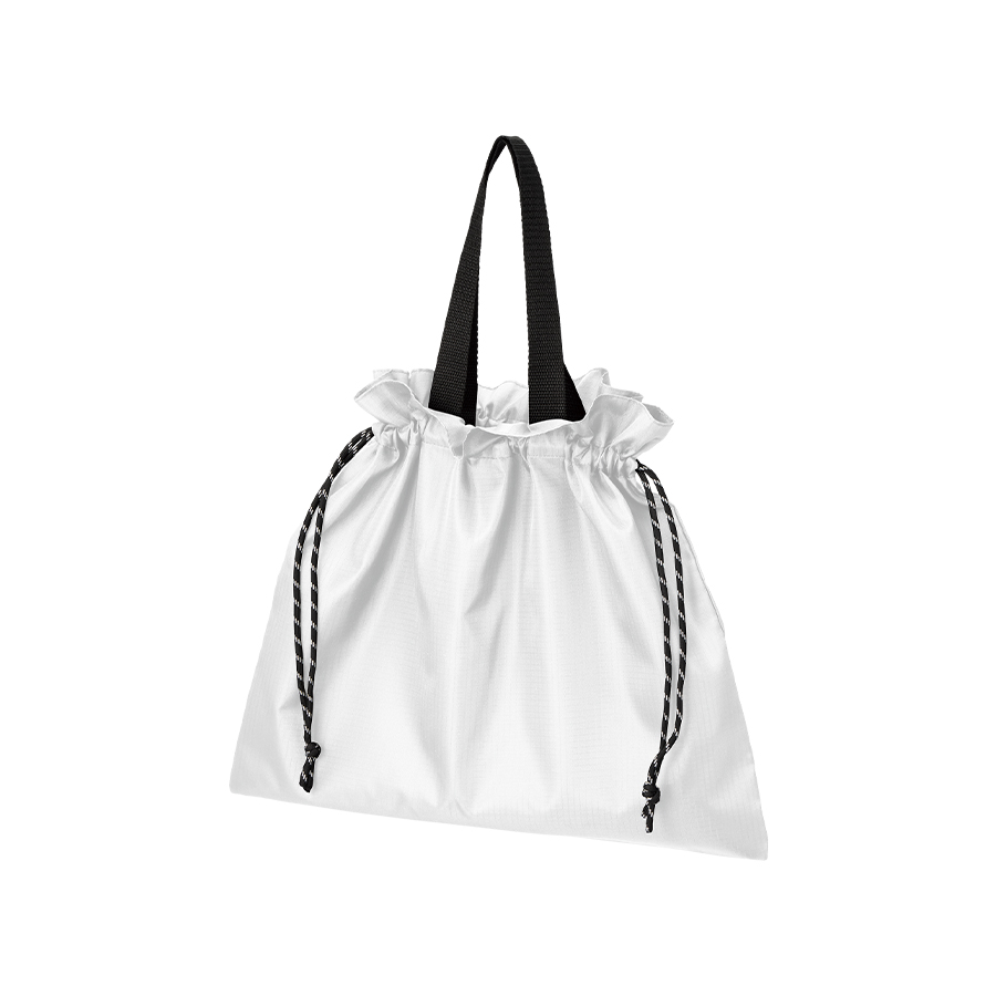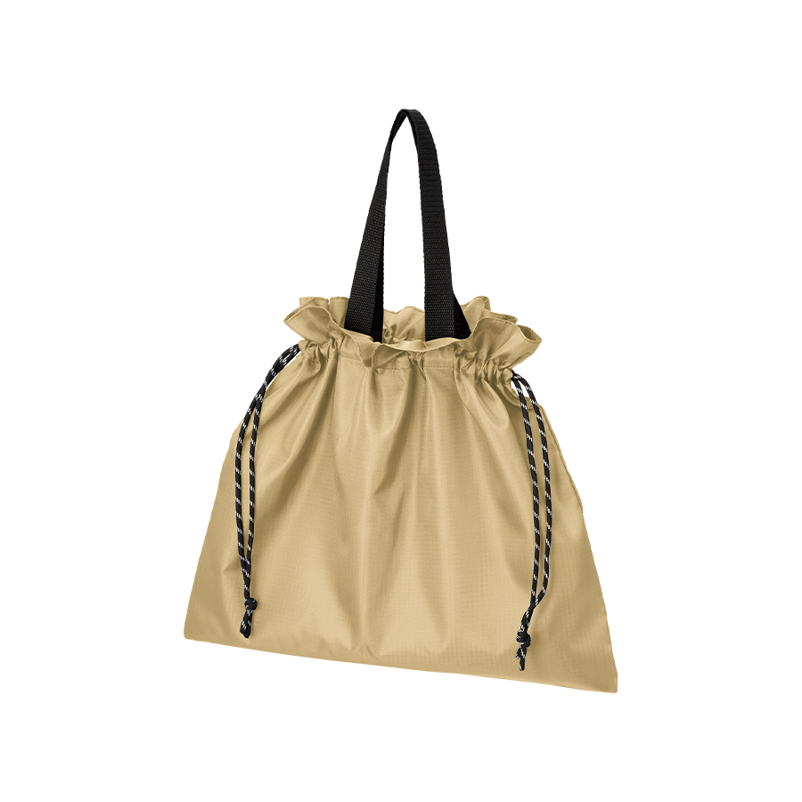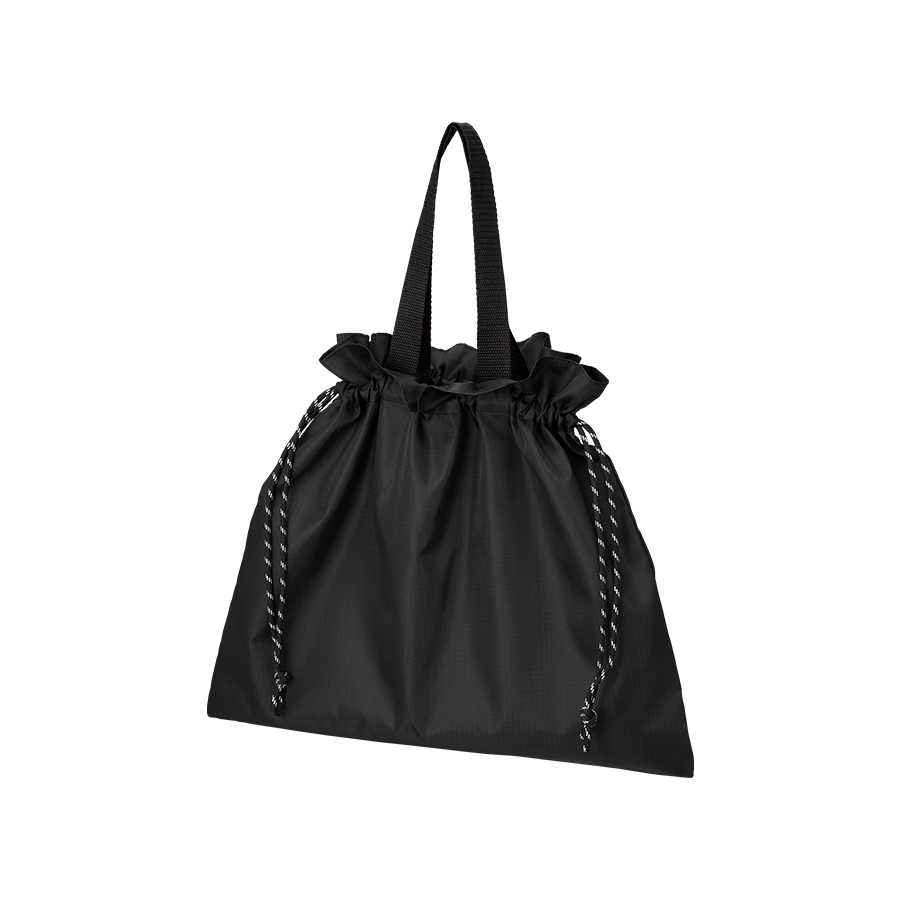 口元のギャザーデザインとリップストップ生地でユニセックスな印象で巾着の柄紐もアクセントになります。