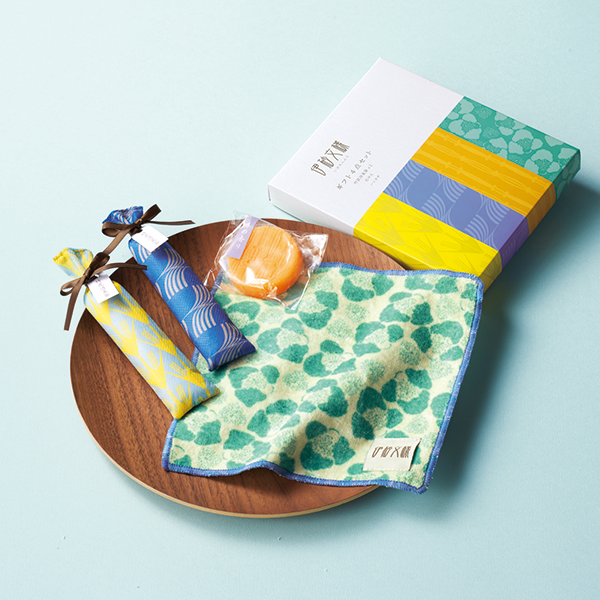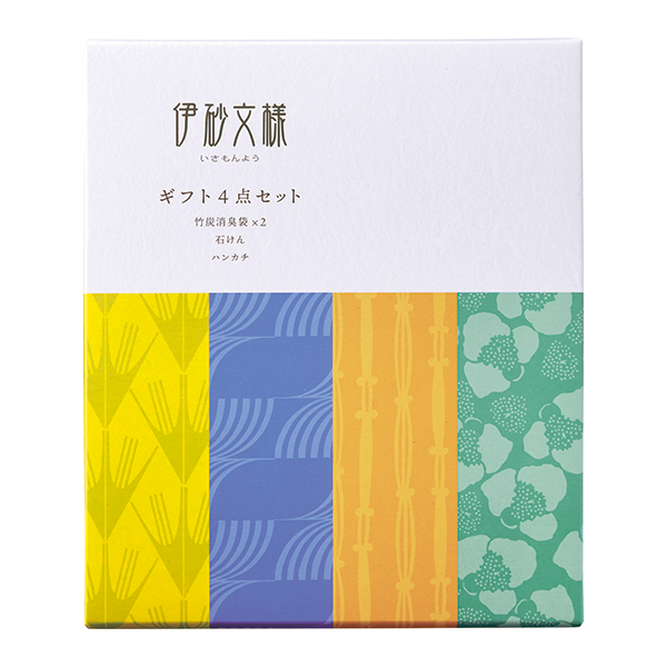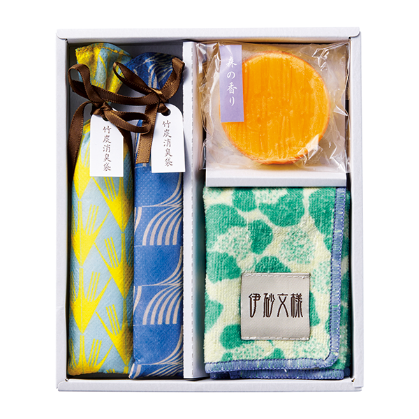 竹炭消臭袋2つに、爽やかな森の香りの固形石鹸、綿100%ハンカチタオルの和柄ギフト4点セット。 京都で生まれた伝統柄「伊砂文様」の版権商品です。