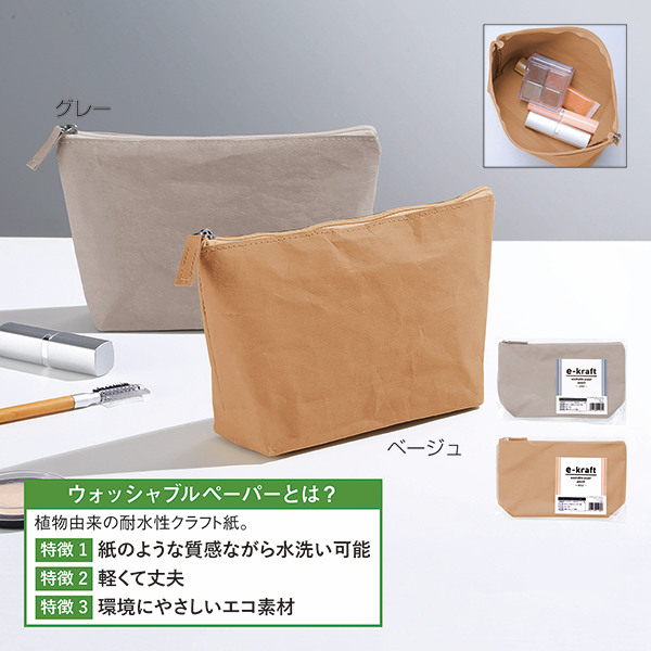 安定感のある形状が使いやすい、定番人気の舟形ポーチ。マチ付きで容量も多いのでデイリーユースに便利です。 水に強いウォッシャブルペーパーを使用しているので、洗面所に持ち込んで使うときも濡れて水浸しになる心配がありません。シンプルかつ機能的なポーチです。