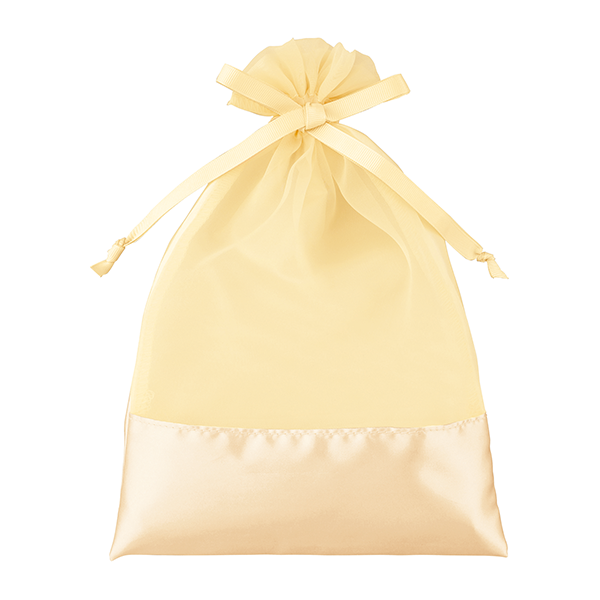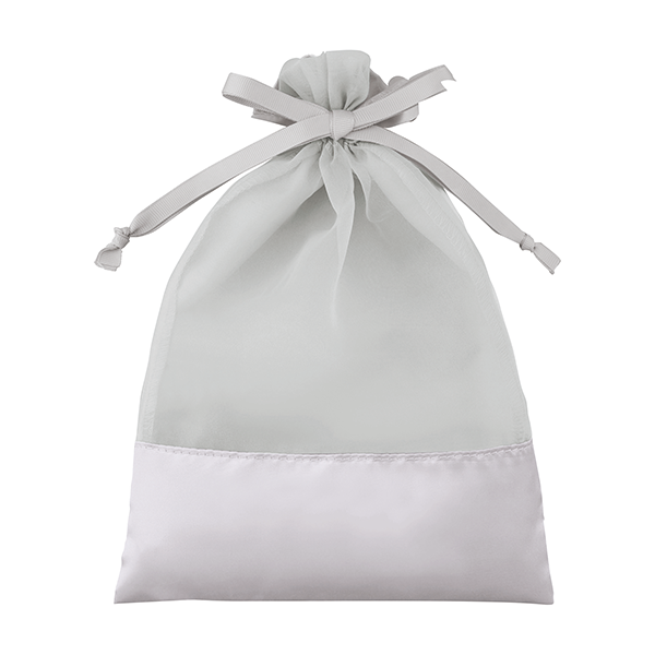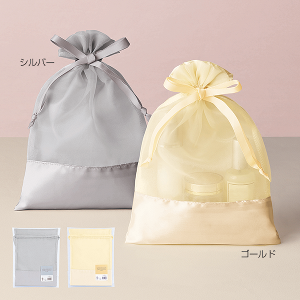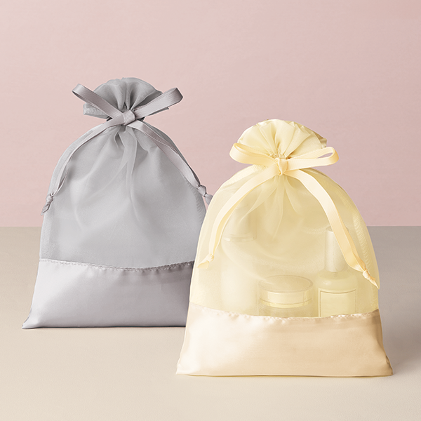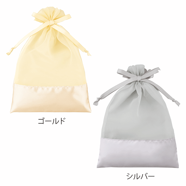 サテン×オーガンジーのエレガントな異素材MIXがおしゃれな巾着です。 ノベルティとしてそのまま配布するほか、中身が透けて見えるのでラッピング資材やギフトパッケージにもおすすめの、特別感がある見映えの巾着です。
