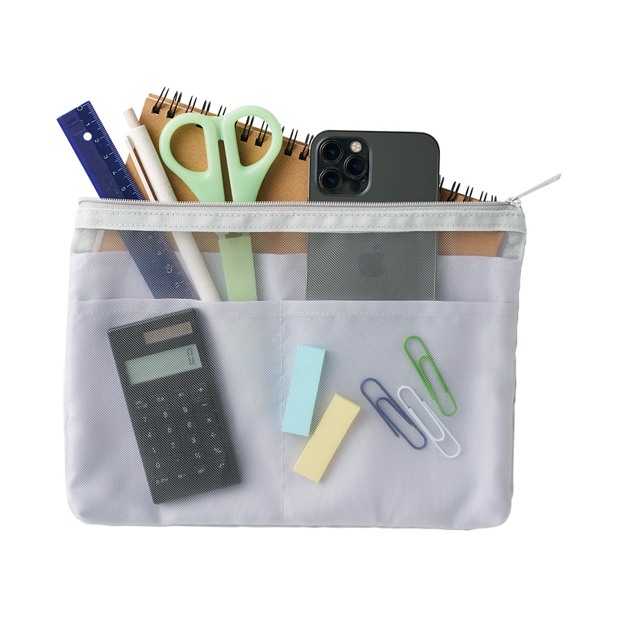 S・Mの2サイズ展開で、MサイズはA5サイズノートやスマートフォンまで入るので私物をまとめてオフィス内を移動する際にもぴったりです。