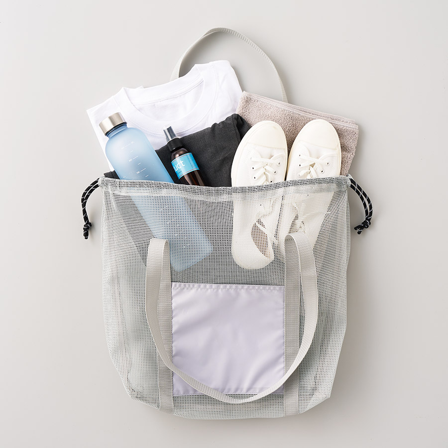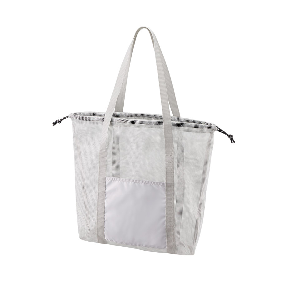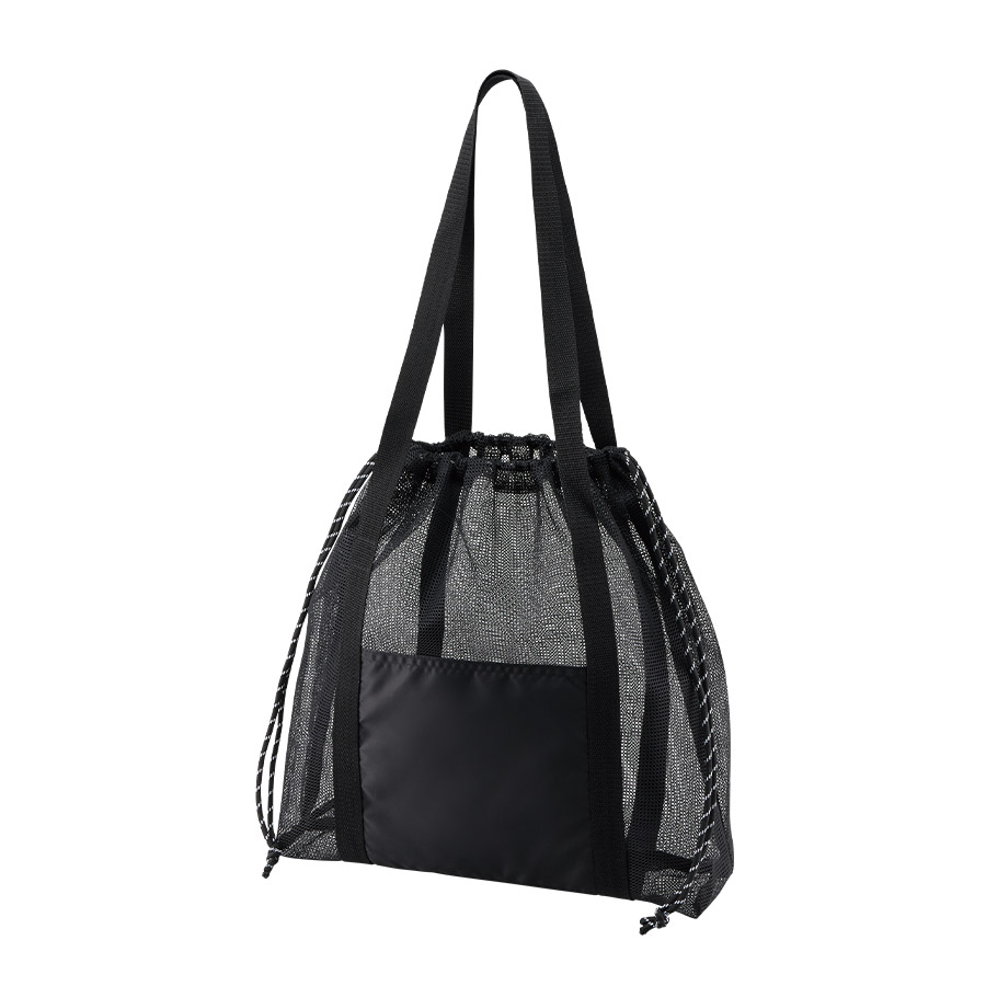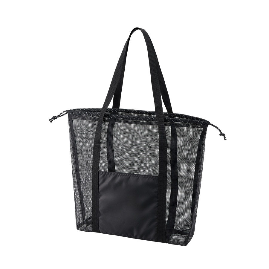 メッシュ素材がポイントのビッグサイズトートです。口元が絞れる巾着タイプなので、荷物が増えても安心感があります。