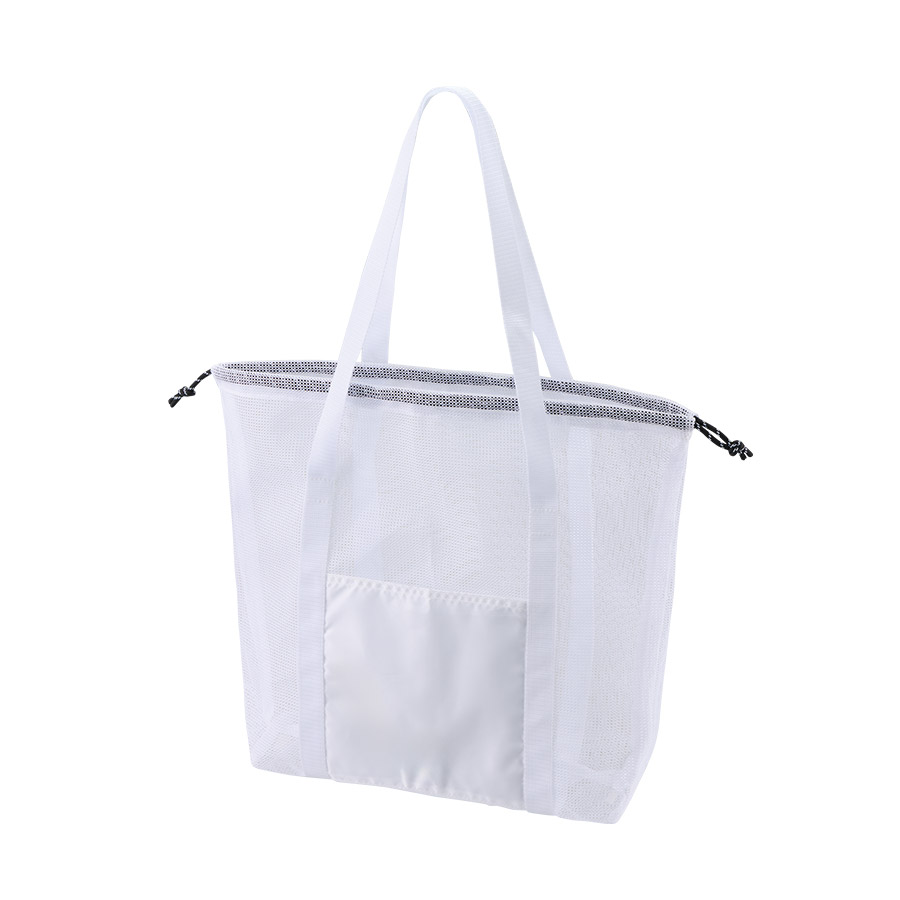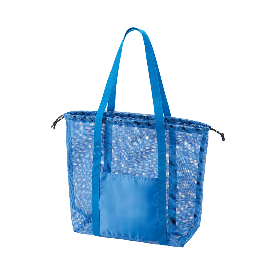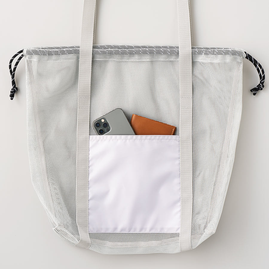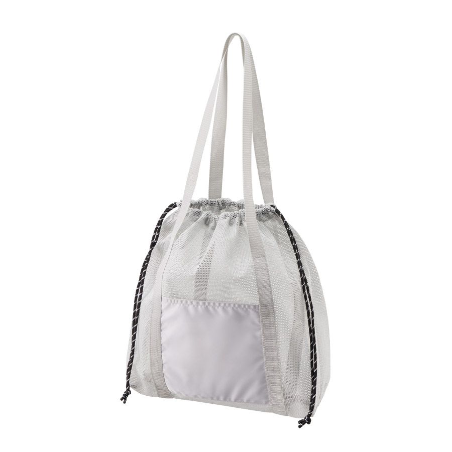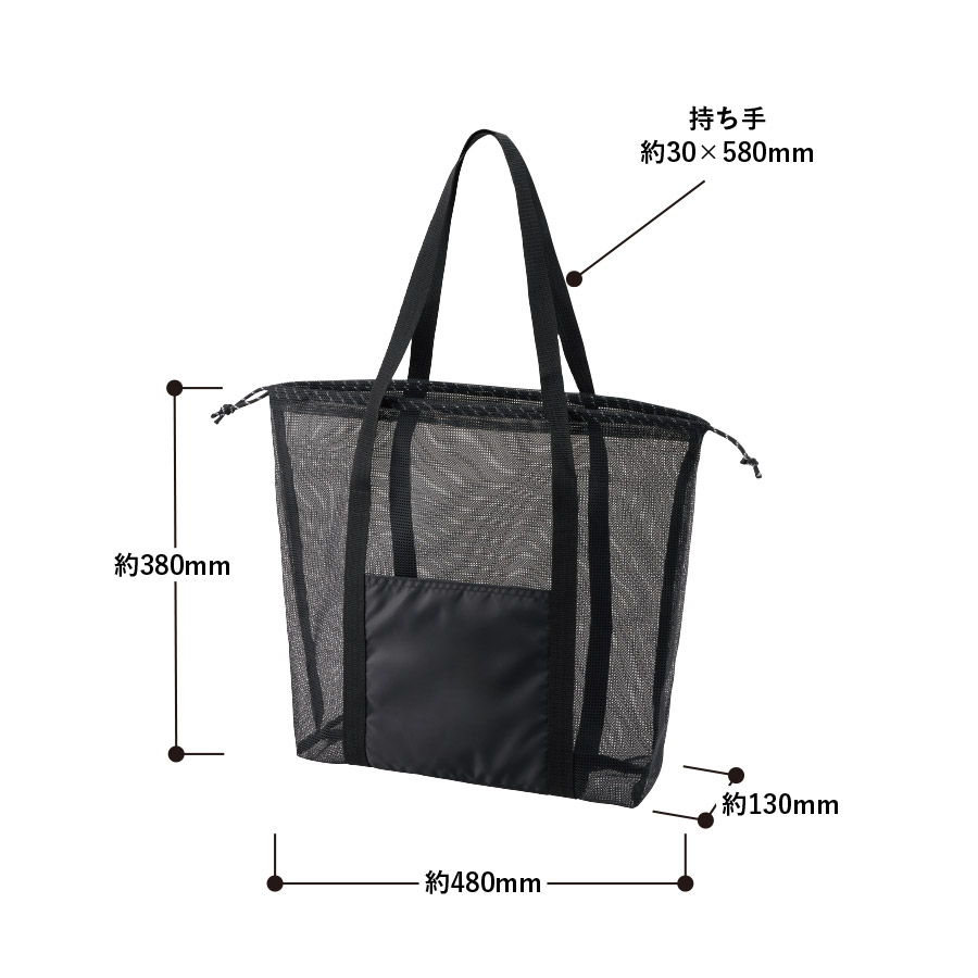 メッシュ素材がポイントのビッグサイズトートです。口元が絞れる巾着タイプなので、荷物が増えても安心感があります。