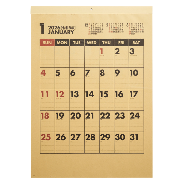 あたたかみのあるクラフト紙の色合いが魅力。前月と後ろ2ヶ月のカレンダー付きが嬉しい実用的なカレンダーです。