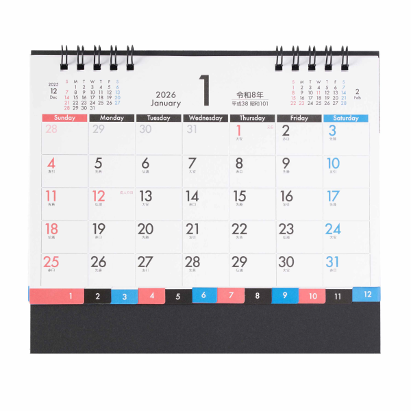 赤黒青の分かりやすい配色でデザインされたカレンダーです。