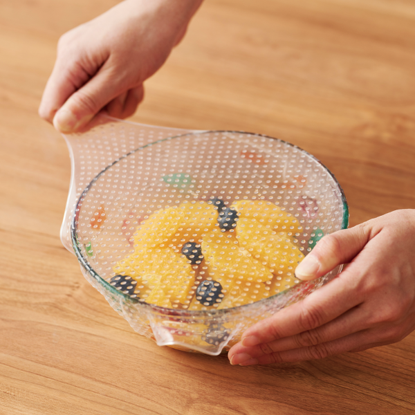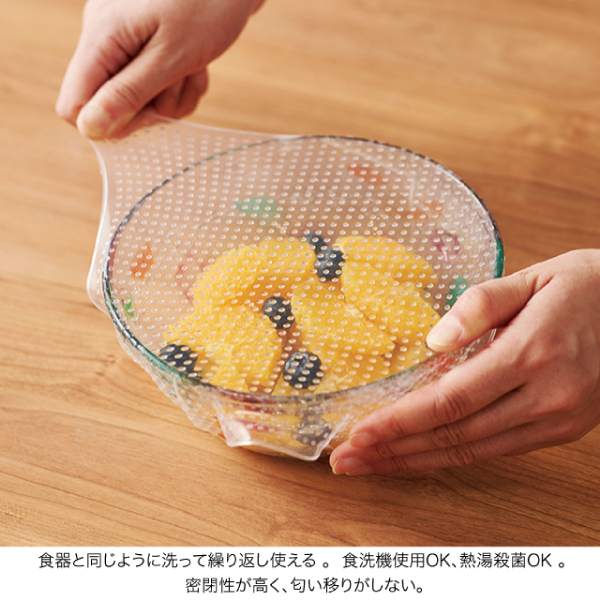 シリコンラップは食品を新鮮に保つだけでなく、環境にも配慮した商品です。洗うことで繰り返し何度も使用できます。冷蔵庫でそのまま保存したり、食べる時にそのまま電子レンジで温めたりできるのも、とても便利! 食洗器にも対応しています。すりおろし調理の際に滑り止めとして器の下に敷くのもおすすめ。