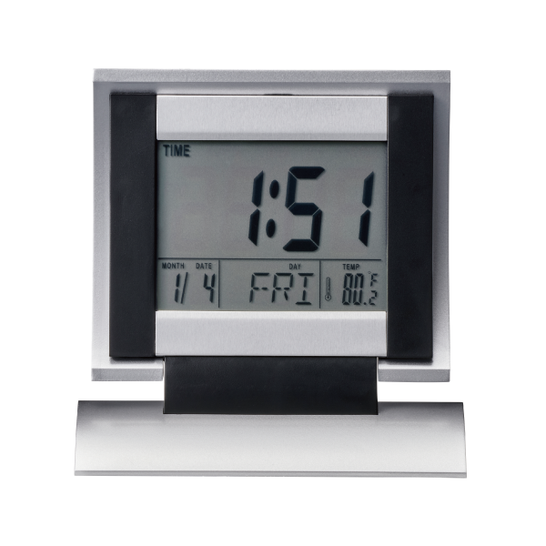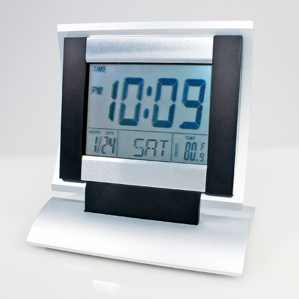 おおきな液晶ディスプレイが特徴のデジタル時計。 液晶が大きいだけではなく、角度調節が可能なので場所を選ばず見やすさ抜群なうえに、コンパクトに折りたたむこともできちゃいます。時計だけではなく、カレンダー・アラーム・温度計と多機能を備えている便利な一品です。創立記念品や卒業記念品に喜ばれます。