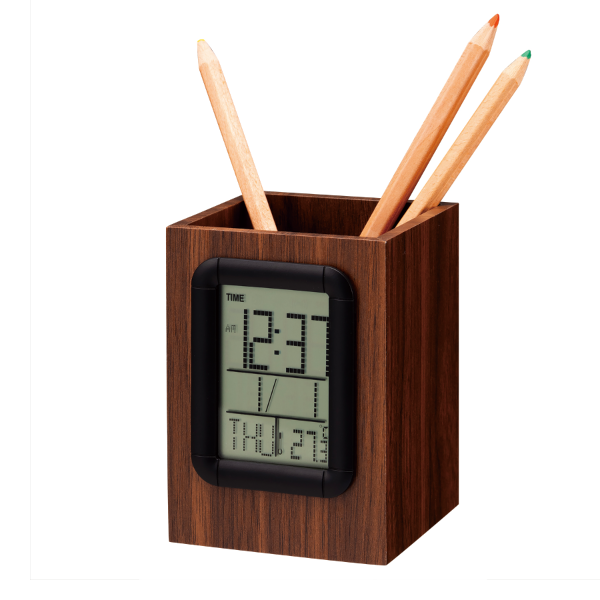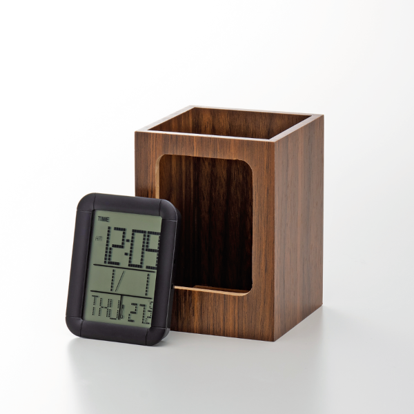 ペン立てと時計が一体になったおしゃれなウッド調ペンスタンドクロックです。 机上もスッキリ整理されます。正面に大きく表示される時計は、時計・温度・カレンダー・アラーム・タイマー・ペンスタンドと機能満載!MDF(Medium Density Fiberboard:中密度繊維板)と呼ばれる、間伐材や端材のチップを原材料としており、サステナブルなアイテムをお求めの方にもぴったりの一品です。