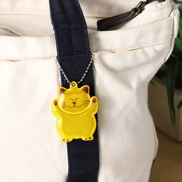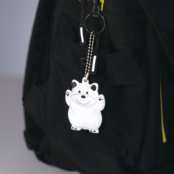 車や自転車のライトの光を反射し、相手に居場所を知らせてくれます。クマ・ネコ・ブタ・イヌのシンプルで可愛い4匹展開。お腹の部分に名入れが可能です。