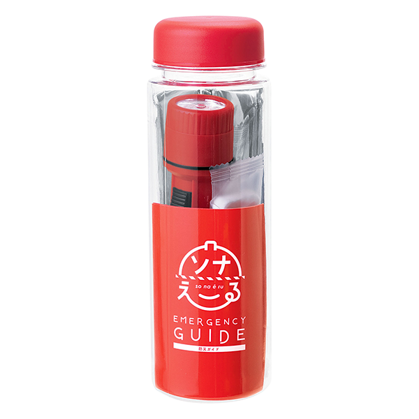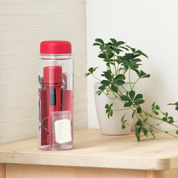 ボトル一つに収まっているコンパクトさと手軽さが人気で、軽量でかさばらず、それでいて実用的なアイテムです。企業ロゴやメッセージをプリントし、展示会記念品・社員配布・地域イベントの配布品として防災意識を高めるプロモーションにおすすめです。