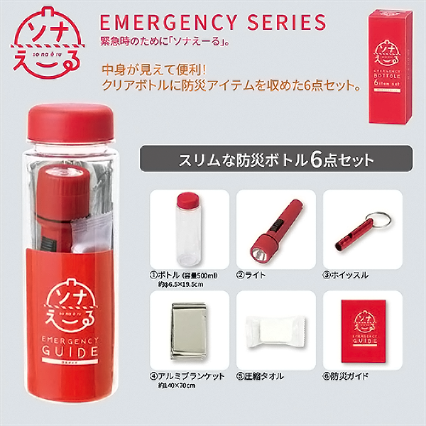 クリアボトルに必要な防災小物をコンパクトに詰め込んだ人気の防災セットです。