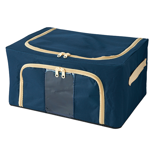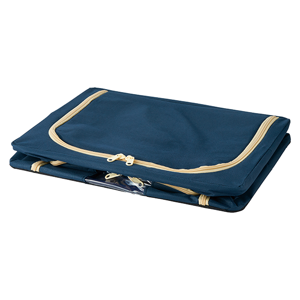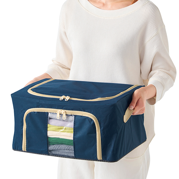 使わない時はコンパクトにたためます。天面と長側面にそれぞれ付いているファスナーから中身の出し入れが可能です。側面のファスナー部分には透明窓が付いているので「これ何が入ってたっけ?」となってしまうのを防ぎます。両サイドに持ち手も付いて、移動や持ち運びもカンタン。