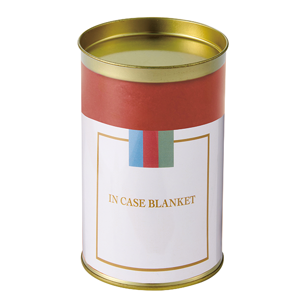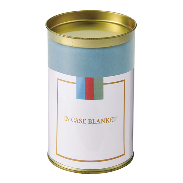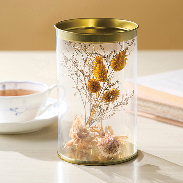 スタイリッシュなゴールドの蓋が印象的な円筒形のクリアケースに、ニュアンスカラーのブランケットを入れました。台紙オリジナル対応も可能ですのでお問い合わせください(※別途お見積り)。クリアケースはディスプレイケースや小物入れとして二次利用も可能です。