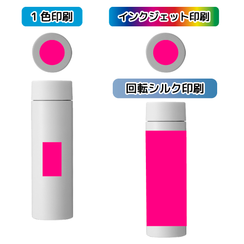 ボトル・タンブラー・マグカップの一色印刷は、「パッド印刷」「回転シルク印刷」の2種類があります。