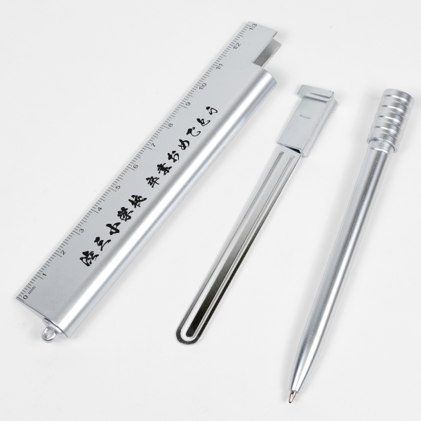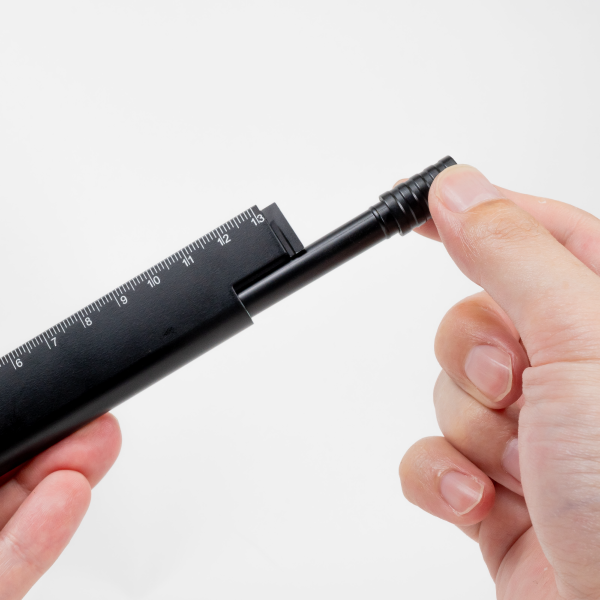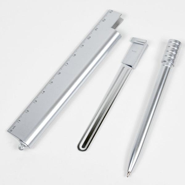 定規、ボールペン、クリップが一体となった、マルチに使える多機能ステーショナリーツール。