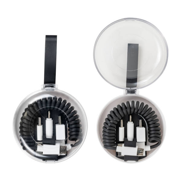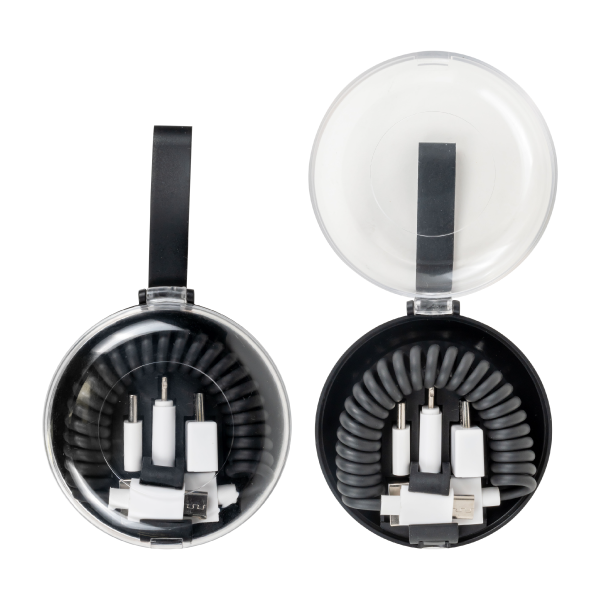 コンパクトなケースに収納されたスマートフォン用充電ケーブル。