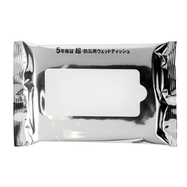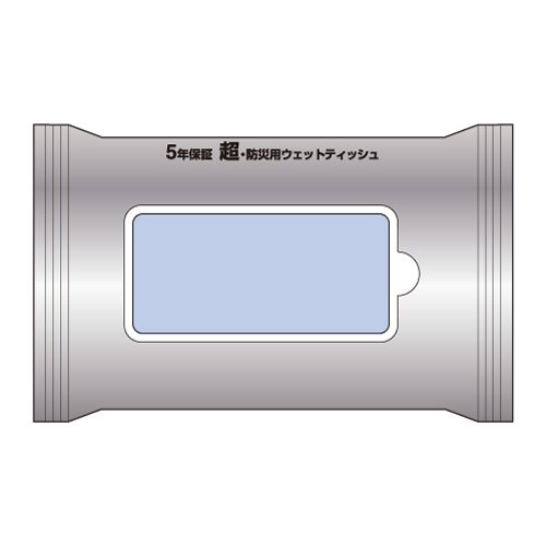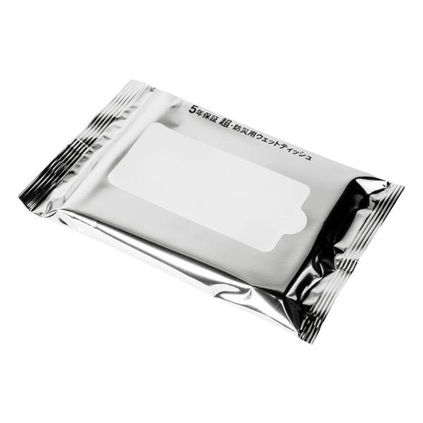 業界最長!「5年保証」の防災用ウェットティッシュ。除菌効果の高いウェットティッシュを採用しており、パッケージには防湿性の高いアルミ蒸着フィルムを使用しているので、製造から5年間の安定した品質保証(※)をいたします。
