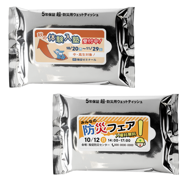100個からオリジナルが出来る防災用ウェットティッシュです。