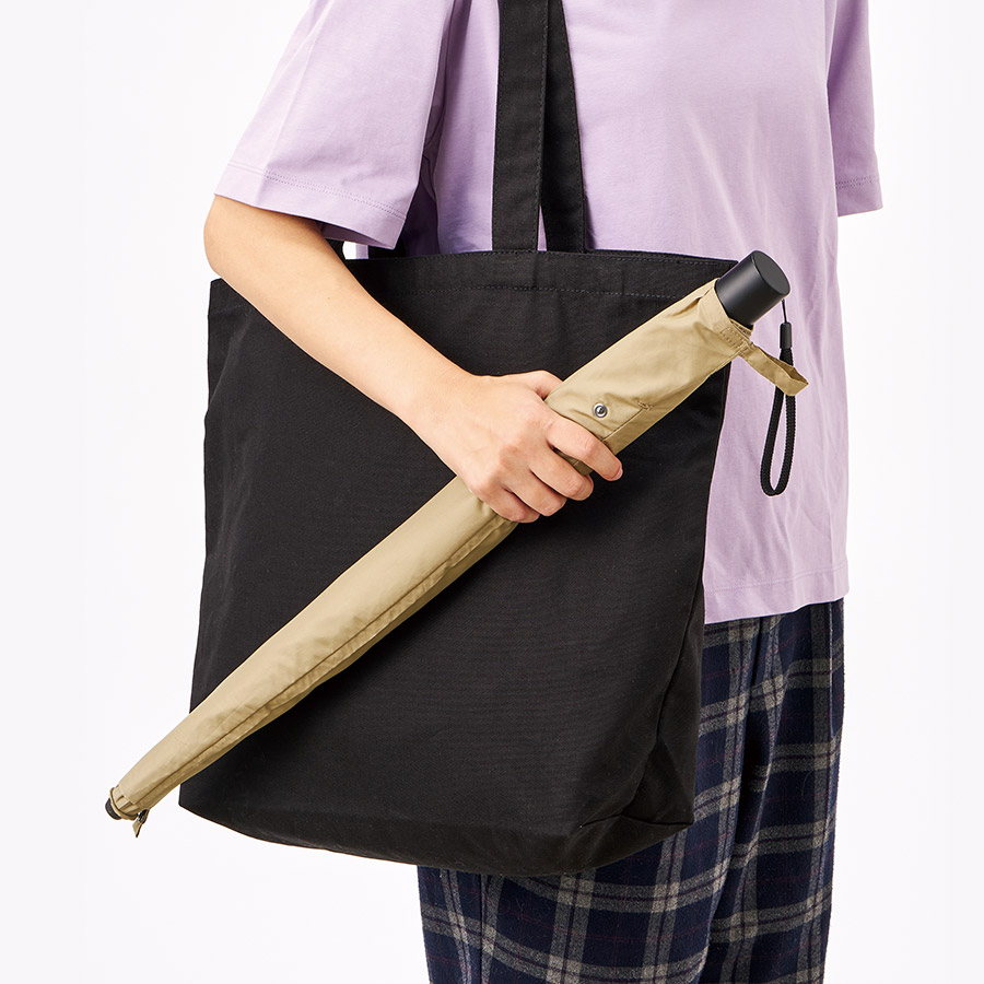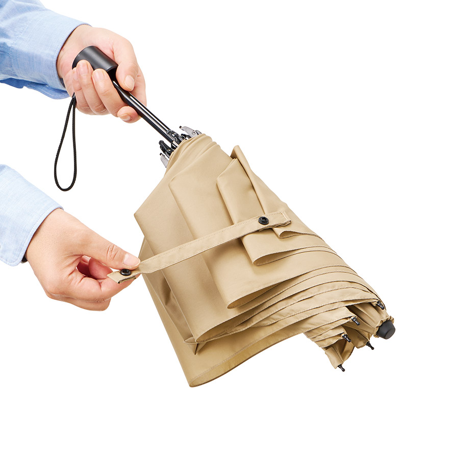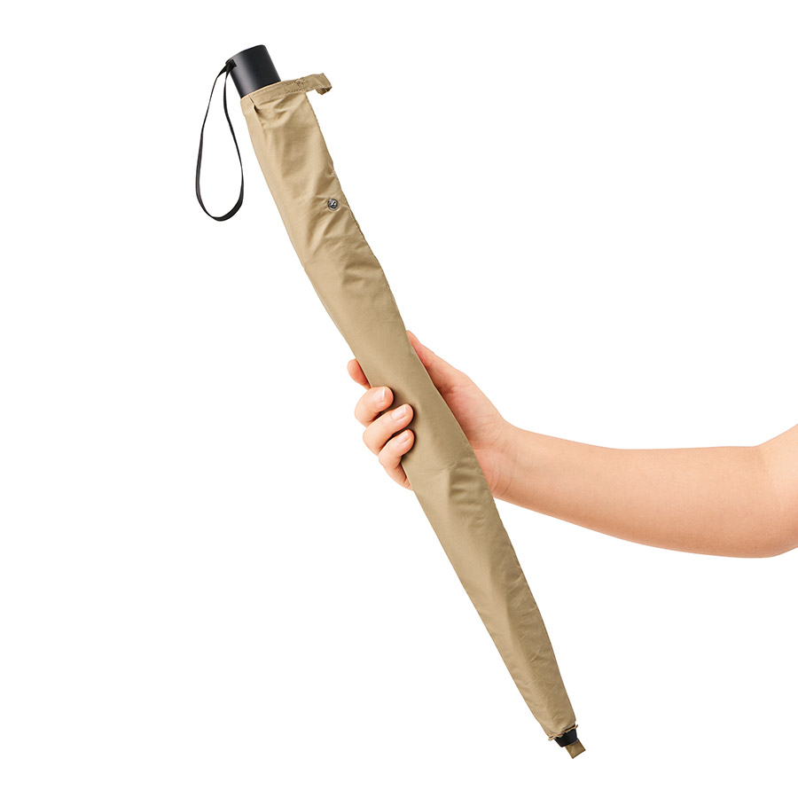 2段傘仕様で、スナップボタンが付いているためカバンに入れる際はたたんで、雨傘として使用したあとは伸ばしたまま手をあまり濡らさずに袋にしまうことができます。