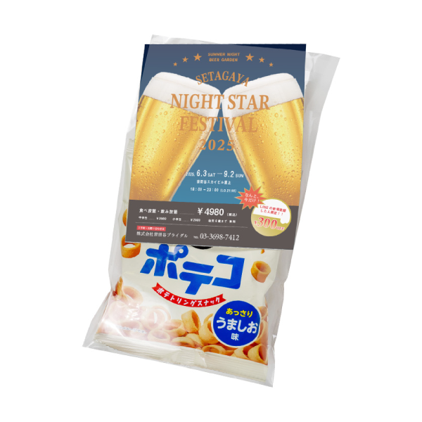香ばしいじゃがいもの風味とカリッと軽快な食感がクセになる味わいで、性別や年齢を問わず幅広く喜ばれます。パッケージラベルは全面オリジナル印刷が可能で、企業ロゴやキャンペーン情報などのPR要素をしっかり盛り込める広いスペースを確保。知名度のあるお菓子という安心感もあり、展示会やイベント、街頭配布など多彩なシーンで活用しやすい商品です。