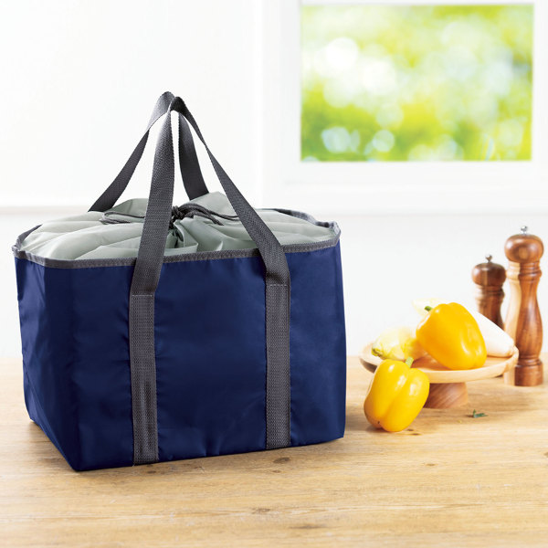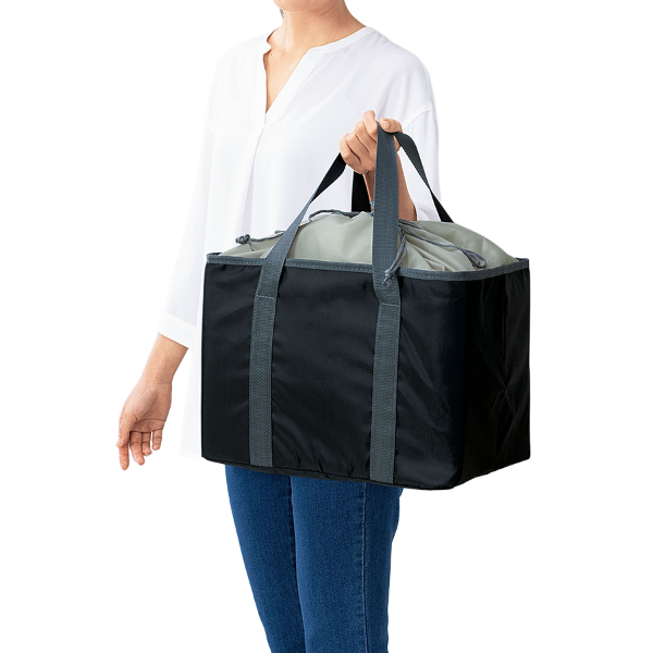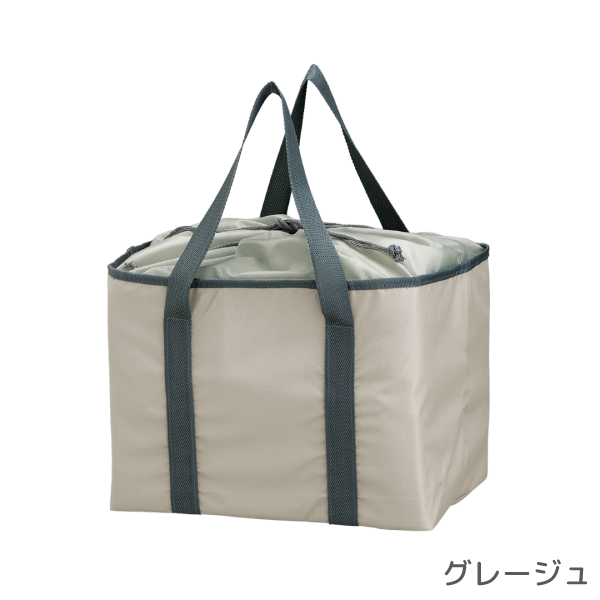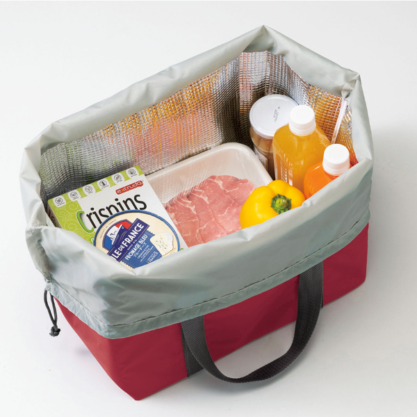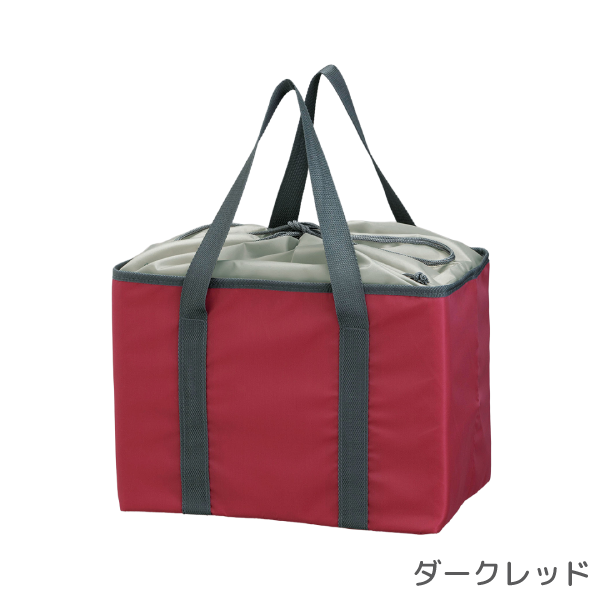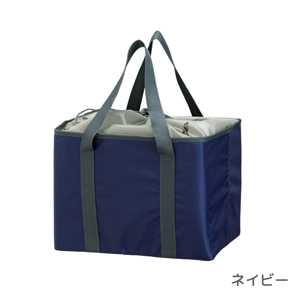 スーパーのレジかごにそのままセットできる便利なサイズ感と保冷・保温機能を兼ね備えたエコバッグです。 余裕ある容量でまとめ買いする際に大活躍します。巾着仕様で中身の飛び出しを防止してくれるため、自転車のかごに入れて使うのもおすすめです。日常で使われる機会が多いため、企業CSRやエコ意識を訴求する記念品・配布品として効果的なアイテムです。