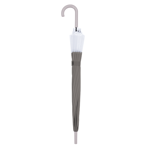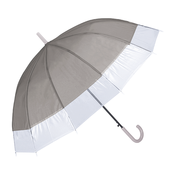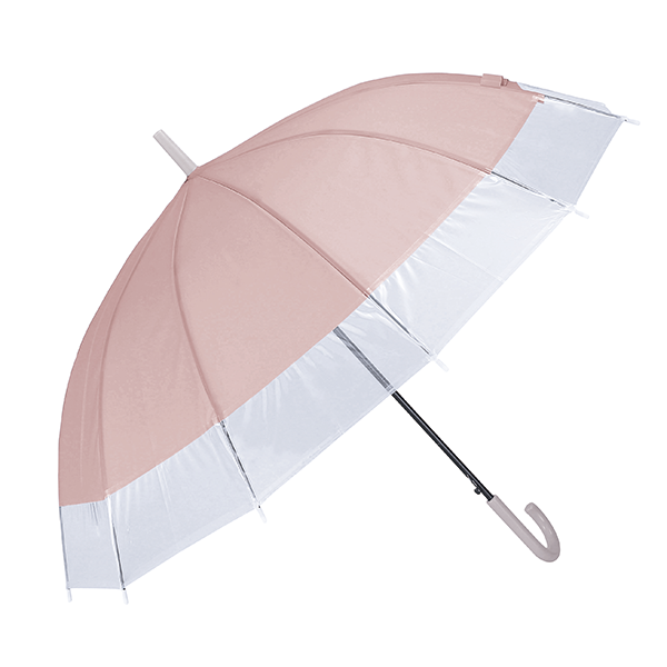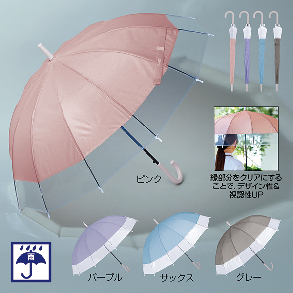 グラスファイバー骨12本の耐久性に優れた傘。クリア×カラーのバイカラーでさり気なくセンスもアピールします。 春夏はUVケアや暑さ対策など、女性の関心が特に高い時期なので、おしゃれや悩みにマッチする販促品をノベルティにすると喜ばれます。ファッションやインテリア、美容関連のイベントにどうぞ。