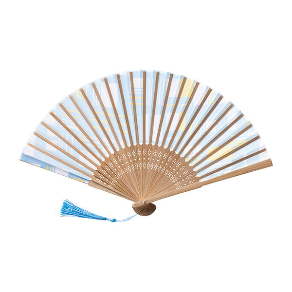 伊砂文様シリーズの新しい夏柄を使用したおしゃれで爽やかな扇子。 涼しい色味と文様で構成されたモダン和柄に、持ち手部分に伊砂文様のロゴとタッセル付き。