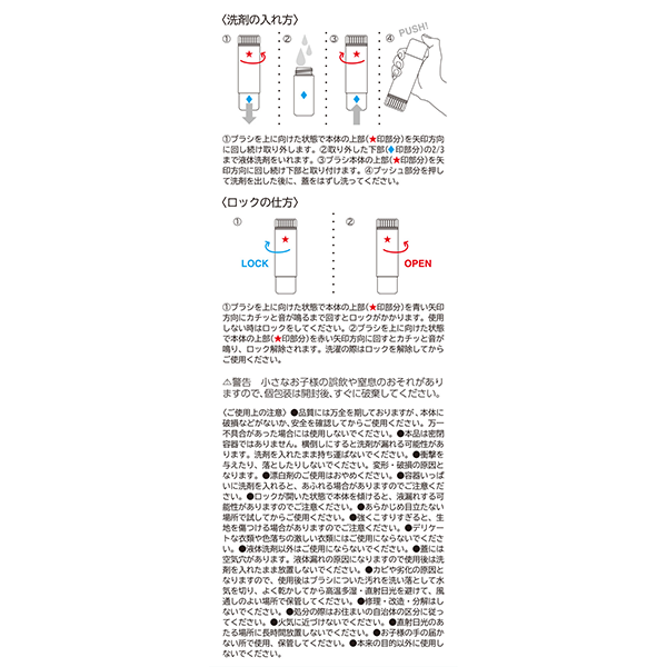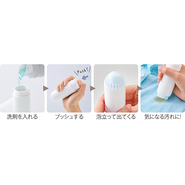 出先で汚れてしまってももうあせらない!ピンポイントで洗える携帯用洗濯ブラシです。 本体の中に液体洗剤を入れてプッシュすると、ブラシ部分から洗剤が泡立って出てくるのでそのまま汚れてしまった部分をこすり洗い!旅行や出張の際にあると心強い1本です。小さいお子さまがいるご家庭にも便利です。