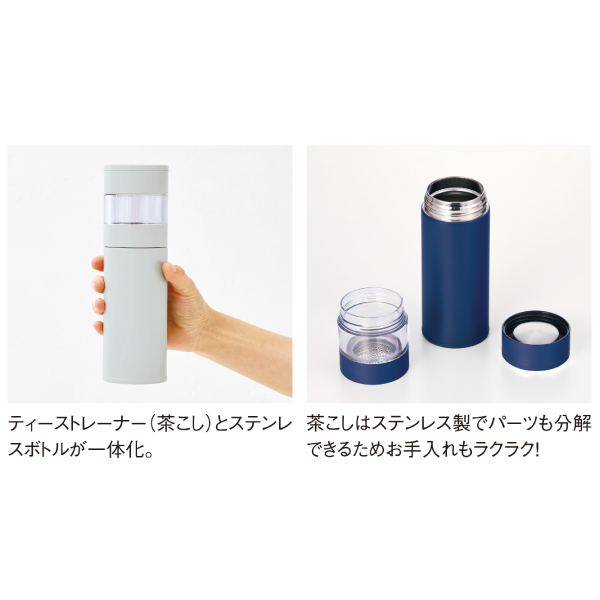ティーポットなしでお茶や紅茶が飲める、茶こし付きのボトルです。 茶こしは取り外せるため、お茶をいれた後はそのままボトルとして使用できます。