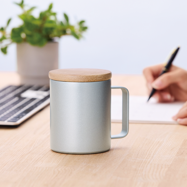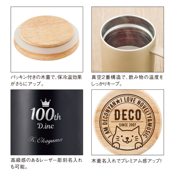 メタリックな質感と天然木の柔らかい雰囲気がおしゃれなステンレスマグです。 真空2重構造で飲み物の温度をしっかりキープします。木蓋にはパッキンもついているため、保冷温もばっちりです。