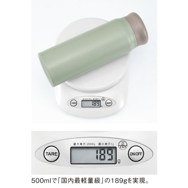 国内でも最軽量級の189gを実現!500ml入る大容量と、軽さにこだわったボトルです。 真空2重構造で保冷保温効果もばっちり。毎日の持ち歩きにぴったりな1本です。