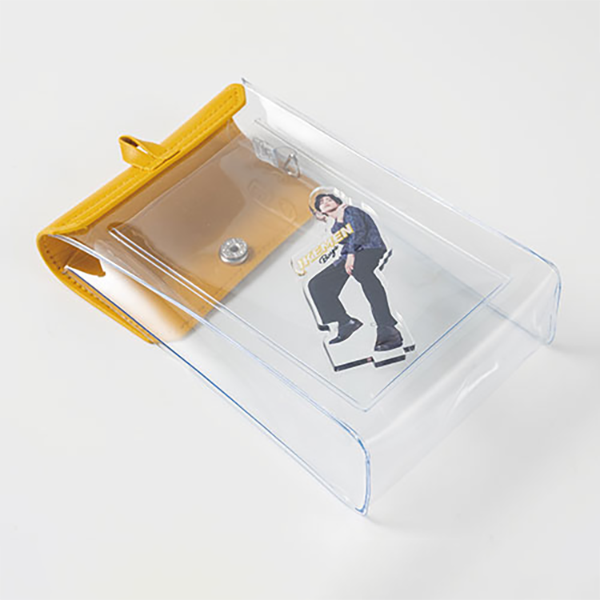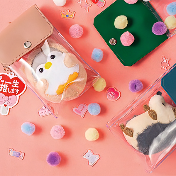 推し活にぴったり!全5色のカラフルなクリアポーチです。マチがあるため「ぬいポーチ」としてもぴったりです。 内側には平たいポケットが付いており、縦長のアクスタやトレカを安定して収納できるのも嬉しいポイント。側面にリングが付いているため、キーホルダーを取り付けることもできます。
