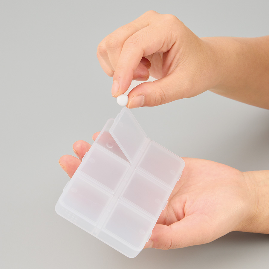 中は仕切りで6つに分かれているため、数種類の薬を分けて入れることができて便利です。