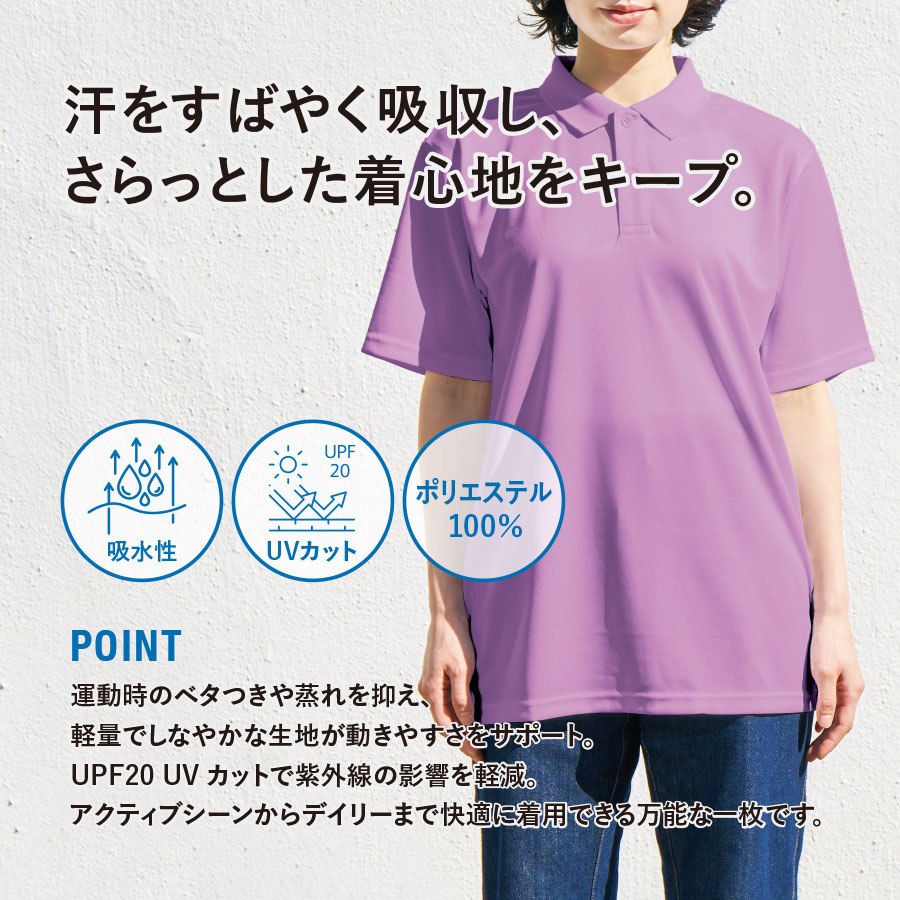プリントに特化した、普段使いしやすい着心地の良いポロシャツです。シンプルで清潔感のあるデザインのため、イベント・物販・ユニフォームなど幅広い用途におすすめです。