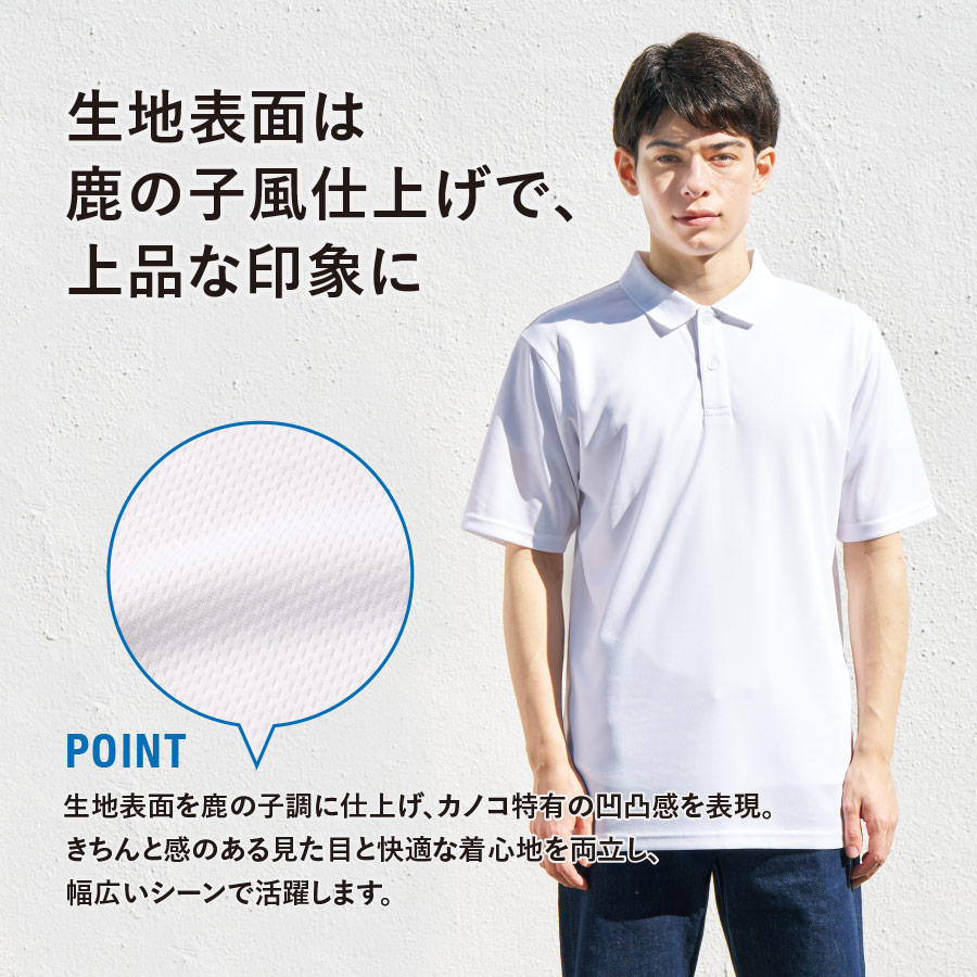 ポロシャツの定番である鹿の子(カノコ)生地風の表情を演出し、程よいきちんと感とカジュアルさを両立。