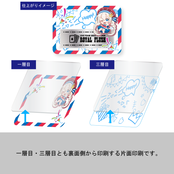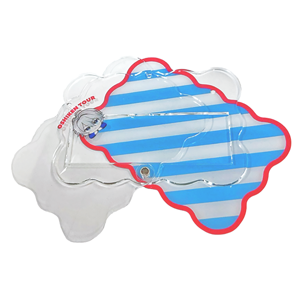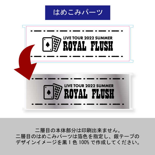 中板のアクリルにはライブの銀テープをデジタル箔で再現でき、公演名や日付を組み込むことで“参戦記念アイテム”として展開できます。
