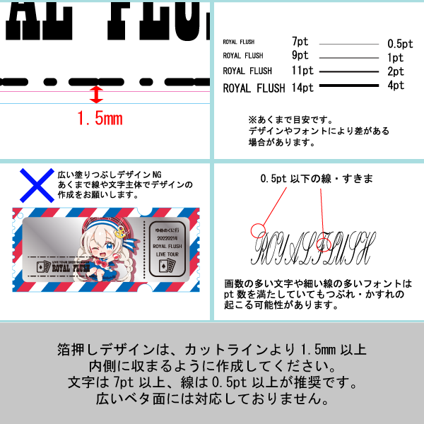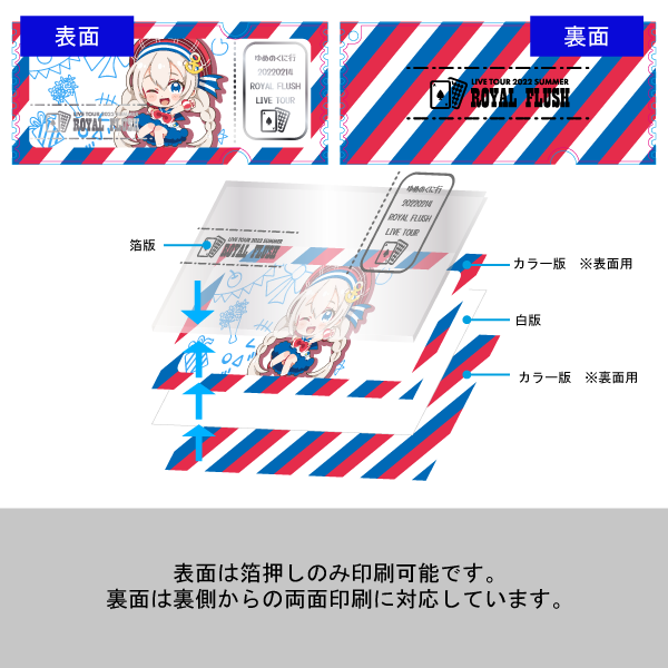 任意の形でのダイカットも対応可能なため、公演タイトルや日付、会場名を入れたツアー別デザインや会場限定仕様などの展開にも最適です。