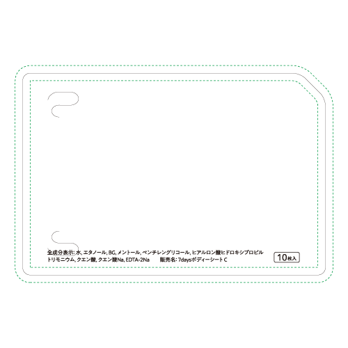 | 素材 | 水、エタノール、BG、メントール、ペンチレングリコール、ヒアルロン酸ヒドロキシプロピルトリモニウム、クエン酸、クエン酸Na、EDTA-2Na |
