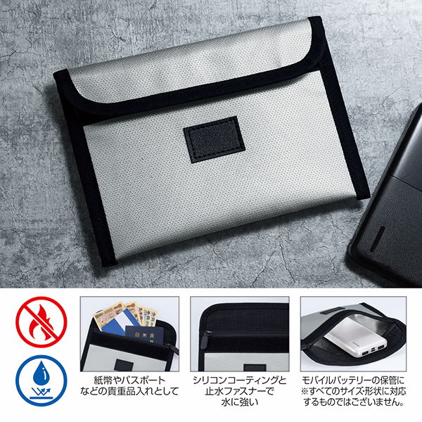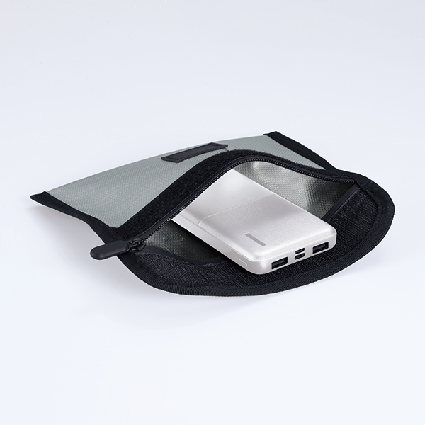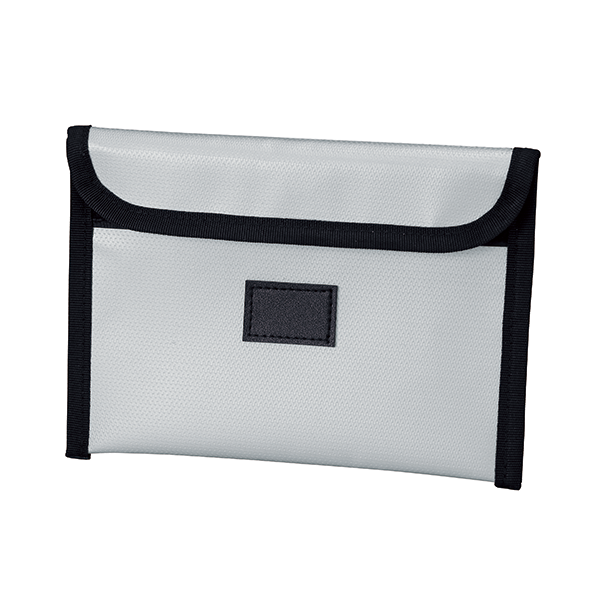 難燃・耐水性に優れた『もしも』に強い安心ポーチ。モバイルバッテリーの保管にも最適です。 年々、防災意識は高まりつつあるため、備えておきたい多機能で便利なアイテムの需要も高まっています。ファミリー向け、個人向けどちらのイベントにも喜ばれるノベルティです。