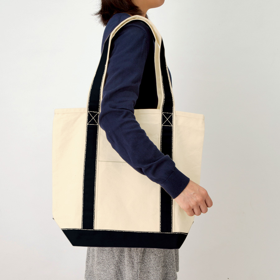 使い心地とデザイン、キャンバスバイカラートート(M)。A4サイズも余裕を持って収容可能な普段使い適したコットントートバッグです。広めの底マチが使いやすく、生地も厚手なのでバッグ単体で自立もします。同仕様でSサイズ、Lサイズもございますので、お好みのサイズからお選びください。毎日の生活をより快適に。