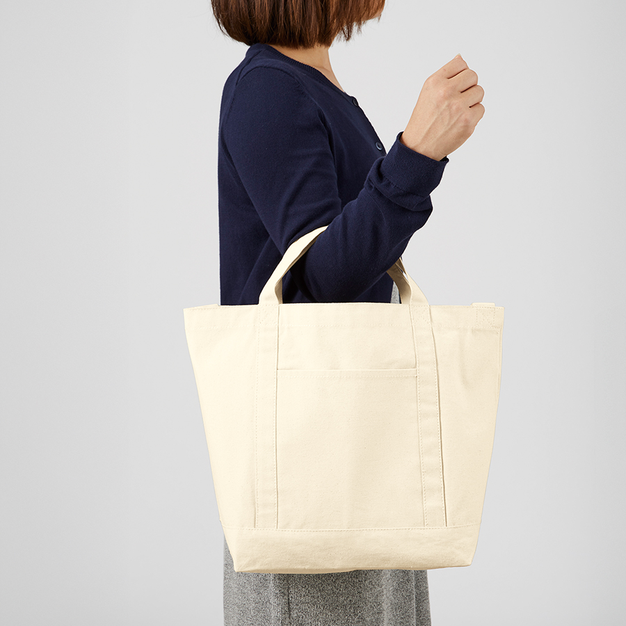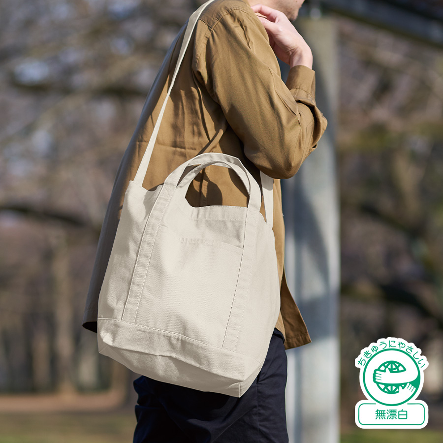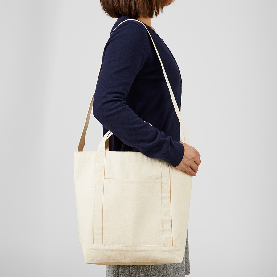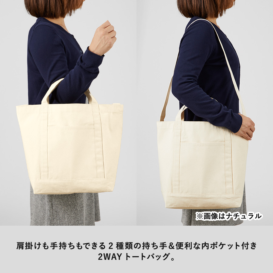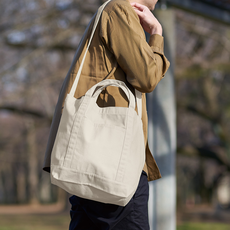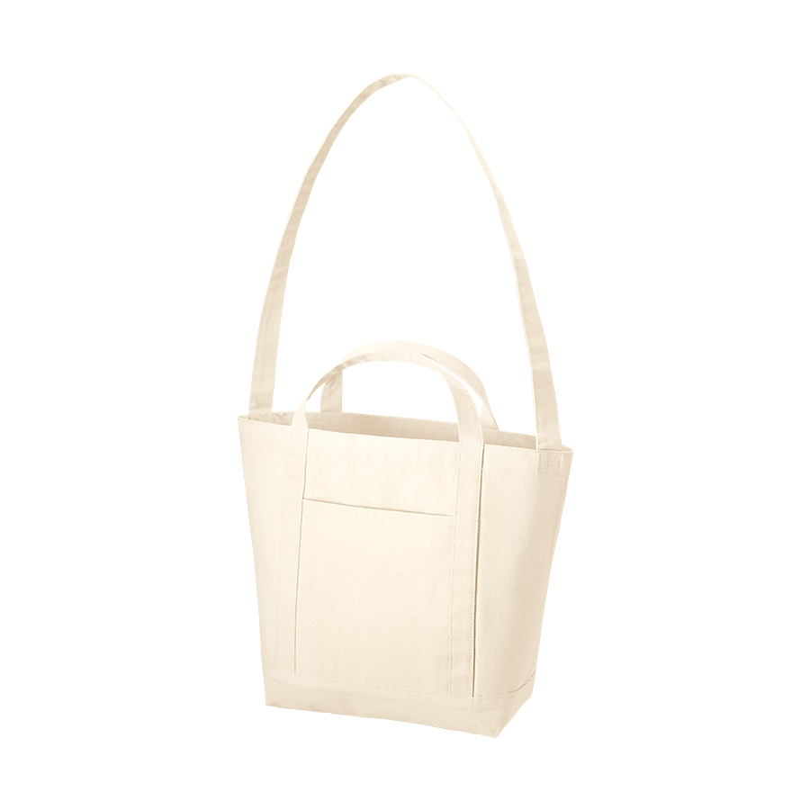 使い心地とデザイン、キャンバスラインショルダートート ナチュラル。ハンドルラインに特徴のある、ショルダーベルト付きのキャンバストートバッグです。手提げ用の持ち手と長いショルダーベルトで、手提げ・肩掛け・斜めがけと入れる中身によって柔軟な使い方が実現できます。12Lと非常に大容量の為、買い物バッグや、トラベルグッズとしても活躍してくれるアイテムです。本体の側面にはスマートフォンやパスケース入れにぴったりな外付けのポケットがあり使いやすさ抜群です。生地も厚く、丈夫なつくりのため長くご使用いただけます。カジュアルなデザインで男女問わず好まれる商品のため、イベントグッズとしても。一度使えば手放せなくなること間違いなし。