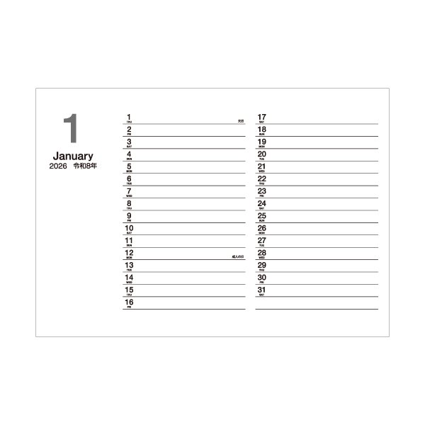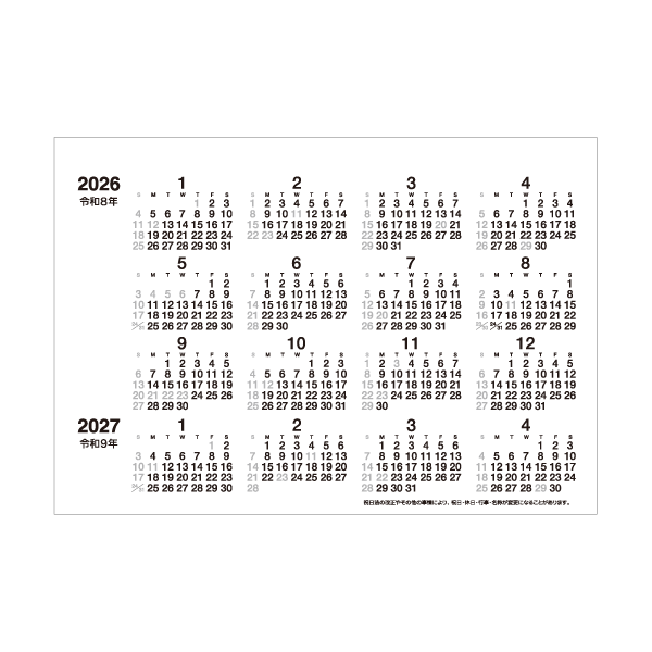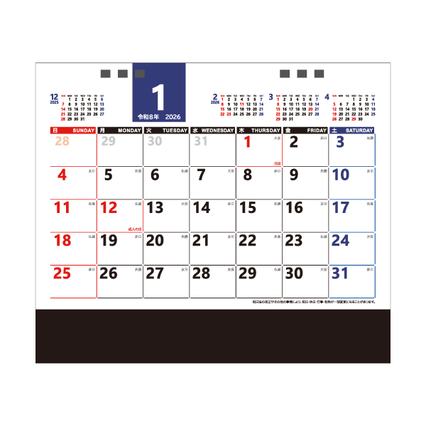 【最短7営業日出荷!】シンプルで見やすい3色印刷の卓上カレンダーです。 裏面は広い書き込みスペースで予定管理に最適。裏面最終ページには翌年4月までの年表付き。