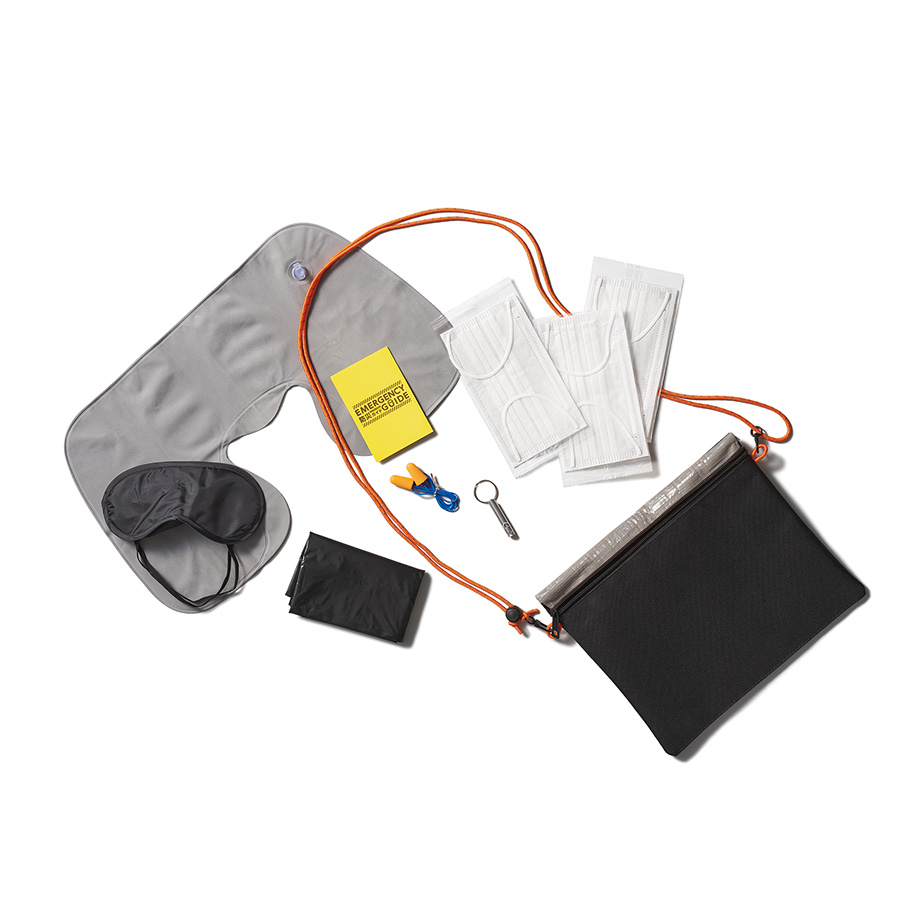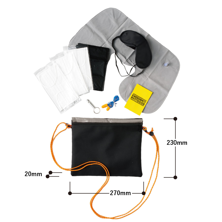 | 本体サイズ | サコッシュ/約270×230×D20mm・シート/約520×800mm・アイマスク/約185×85mm・ホイッスル/29×46×9mm・ゴミ袋/800×900mm・耳栓/φ12×680mm・ネックピロー/440×265mm・ガイド/70×105mm |