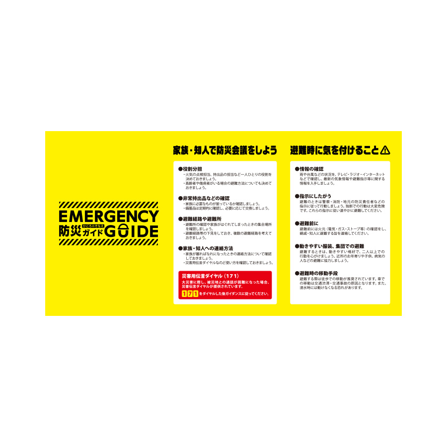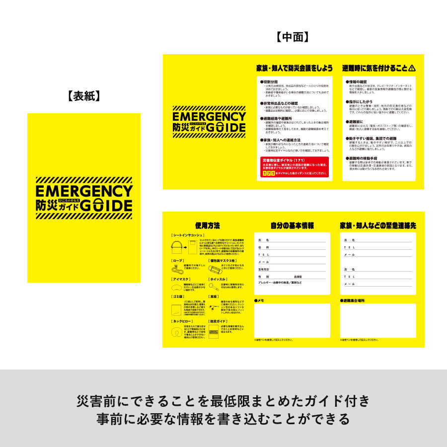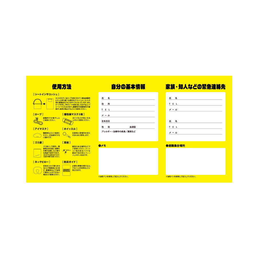 | 素材 | シートインサコッシュ/ポリエステル、PE 他・マスク/不織布(PP)他・アイマスク/ポリエステル・ホイッスル/アルミ 他・ゴミ袋/PE・耳栓/EVA 他・ネックピロー/PVC・防災ガイド/紙 |