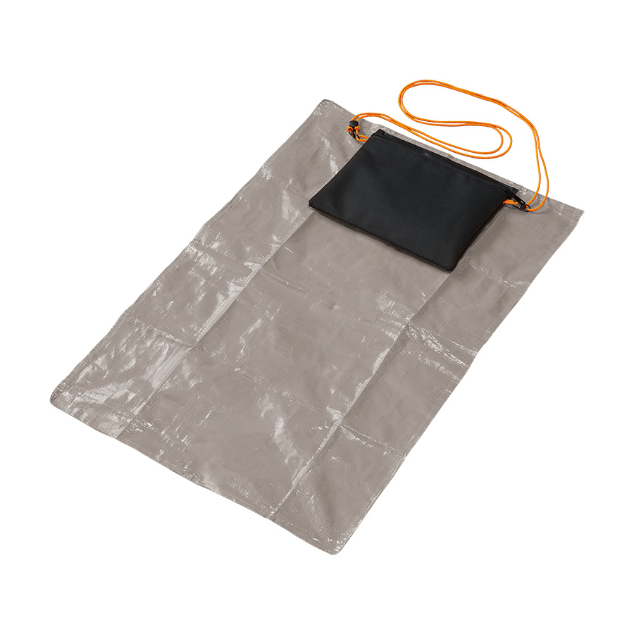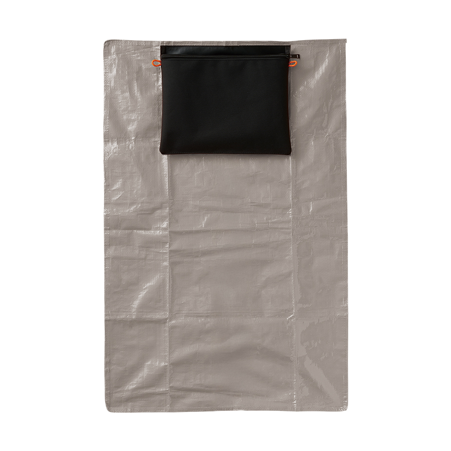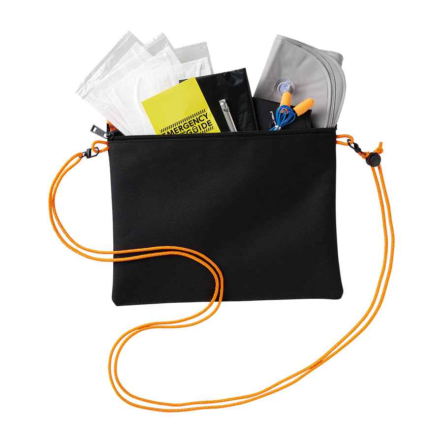 サコッシュとシートが一体化したオリジナル防災セットです。一時避難用に役立つアイテム10点をコンパクトに収納しています。