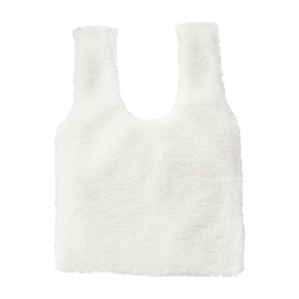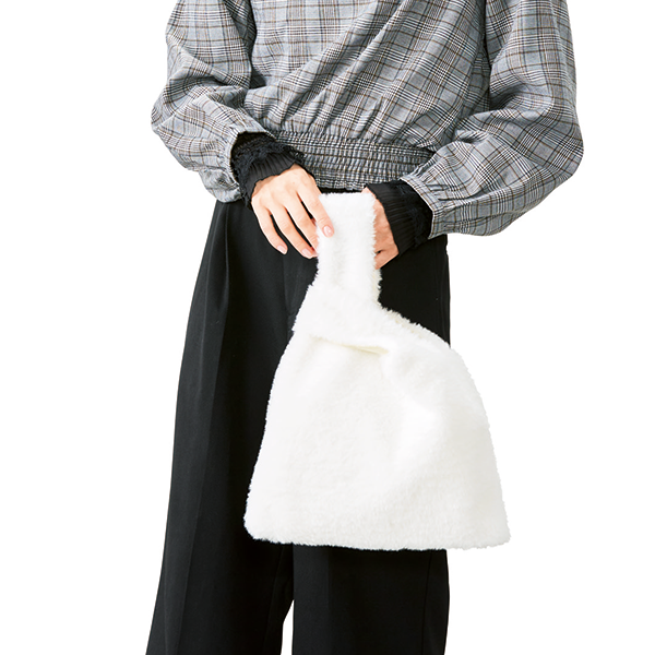 フェイクファーで毛足長めのふわふわな肌触り、流行のワンハンドルスタイルになるトートバッグ。目を引くかわいいシマエナガのパッケージも魅力。